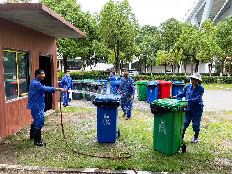 6月20日上午,组员合力清洗分类垃圾桶、更换垃圾袋