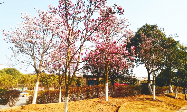 北入口广场占地22500平方米,入口东西两块坡状绿地上对称展示荆门特有的对节白蜡桩景,并用植物修剪“激情省运、魅力荆门”模纹色块。入口通道上的花坛中满植五颜六色时令草花组成色彩欢快、动感跳跃的图案,配以植物修剪成型的会徽、会标植物模纹图案,展现荆门的省运会文化气氛。