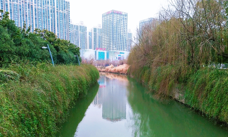西入口广场为贵宾通道,入口处设置“双狮迎宾”扎景。两侧绿地种植五针松,黑松,罗汉松等树体端庄、造型各异的桩景,昭示荆门人民以一颗真诚的心笑迎八方来客。颇具特色的荆门生态运动公园水生植物观赏区南北长1200米,宽为12米-75米,常年水位1.5米-2.5米。水景采取中西合璧的设计理念,贴近自然,引入喷泉、湿地、亲水步道、驳岸,以多种形态丰富景观语言展示自由舒展的空间形态。河道边设置各式的亲水平台和游步道,生态驳岸上种植大量开花地被和水生植物,市民可以漫步河边,与鸟类、鱼类亲密接触。