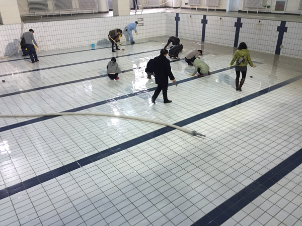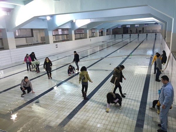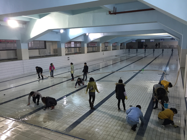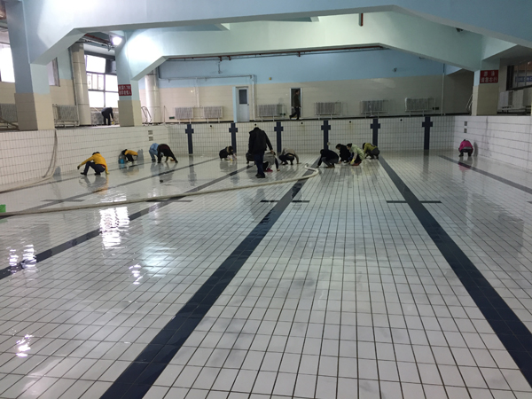 2015年2月26日,游泳馆员工正在对泳池进行清洁消毒的场面。