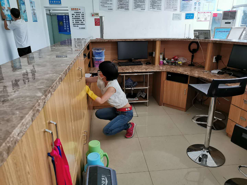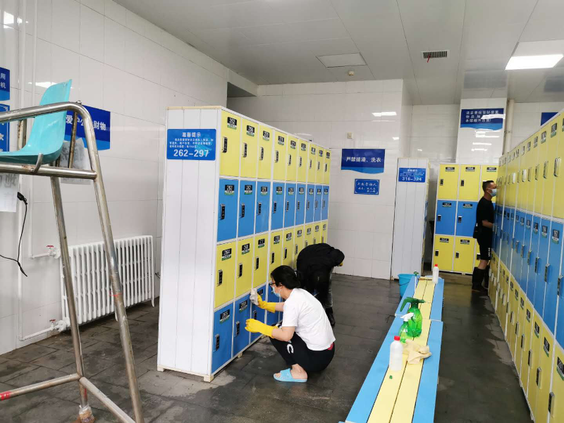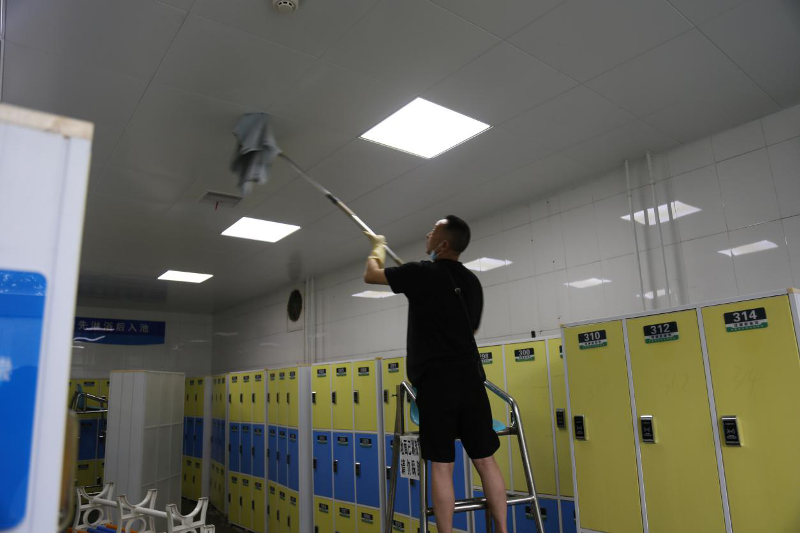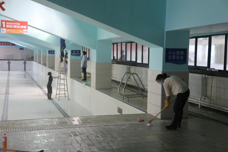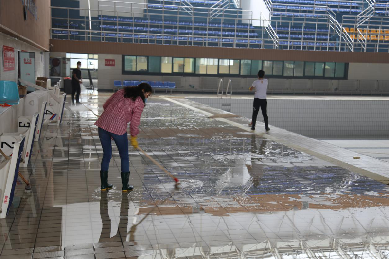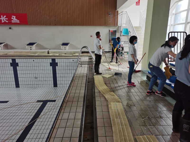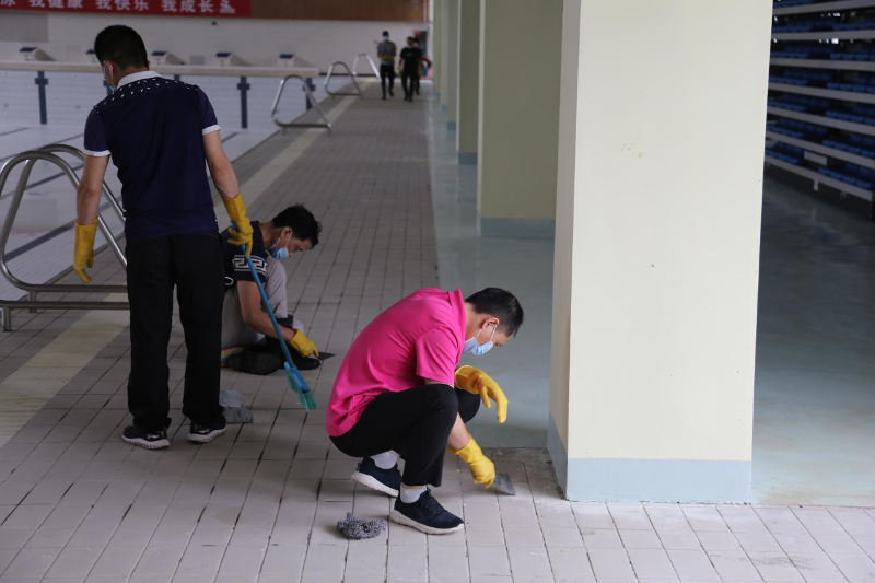 受新冠肺炎影响,汉通游泳馆至目前为止仍处于闭馆状态。随着疫情的有效控制,各地陆续出台了相关复工政策,我们翘首以盼正式开馆的通知,积极迎接开馆日期的到来。2020年5月19至22日,25日至26日,为保证复工后安全的游泳环境,汉通游泳馆组织全体在职职工对游泳馆进行了全面的消杀工作。清扫之全面,消毒之彻底,力度之大更是前所未有。消杀的同时我们也更注重个人防护,要求所有职工进出馆前必须测量登记体温,用消毒液喷双手,佩戴口罩,消杀期间不允许扎堆,开门窗通风,各自按划分的区域清扫。