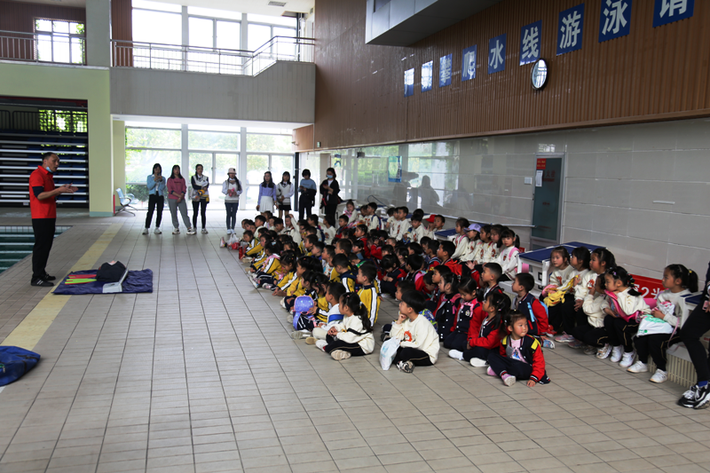 小朋友们终于来到期待已久的游泳馆,都非常兴奋,在工作人员的指导下,小朋友们有序坐在泳池旁,游泳馆救生队长为他们讲解游泳救生及小孩防溺水知识,并示范了科学自救及营救方法。