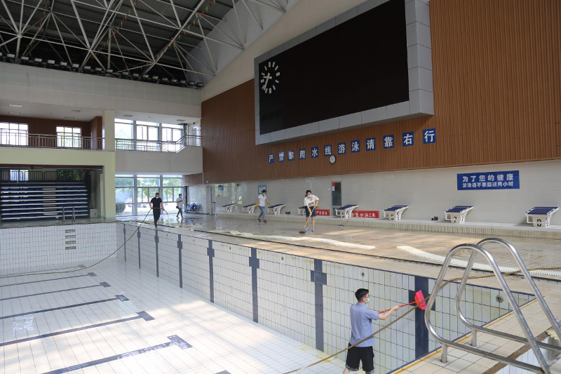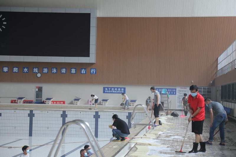 为了确保水质达标和泳客安全,给广大市民提供更好的游泳环境,6月11日上午,汉通游泳馆进行比赛池大清扫劳动。公司从上至下齐上阵,分工明确,装备齐全,对池内、岸上、跳台、地板等每个角落细菌和污垢先用铲子铲刷,然后用水枪冲洗。大家干劲十足,现场一派热火朝天。设备组人员对泳池水循环系统、过滤系统等进行了全面检修及调试。经过大家的辛勤劳动,泳池地面及水槽等每个角落都被打扫的干干净净,让池内焕然一新。比赛池将于6月16日(下周三)开放。