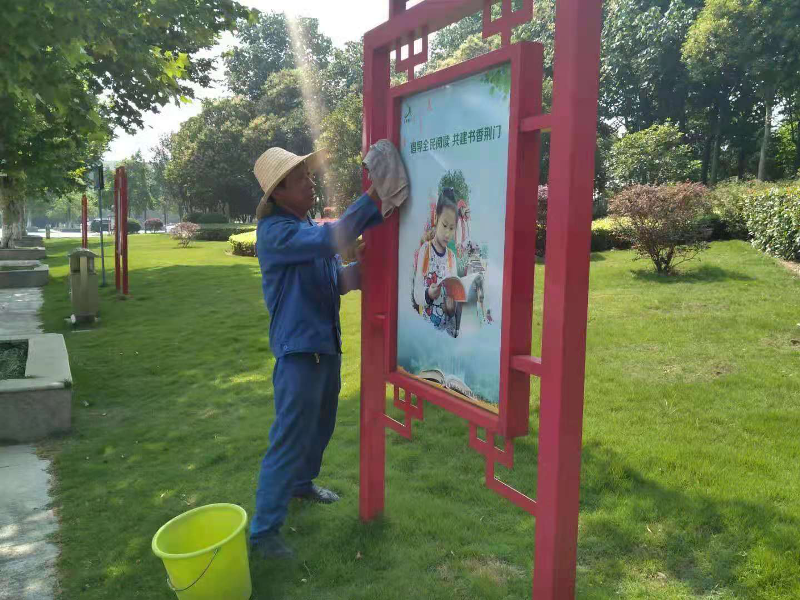 沙滩组蔡班长清理标示标牌上的灰尘